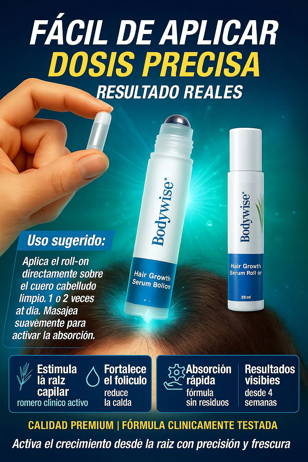 Se aplica directamente sobre el cuero cabelludo en las zonas donde se desea estimular el crecimiento, usando el roll-on y masajeando suavemente.