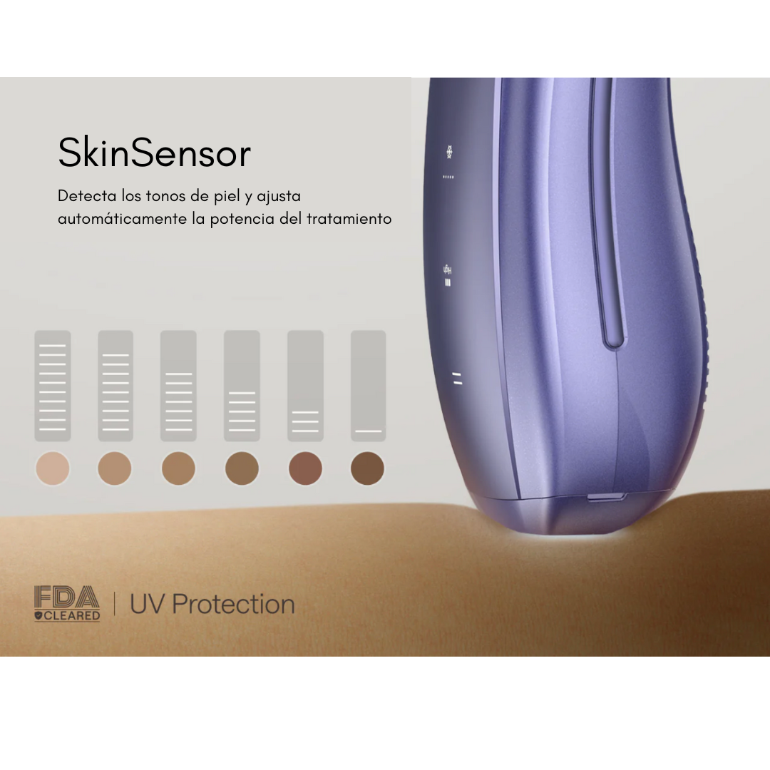 La nueva tecnología de protección de la piel adapta automáticamente la intensidad de cada flash al tono de la piel, proporcionando de forma segura la mejor cantidad de energía (o ninguna).